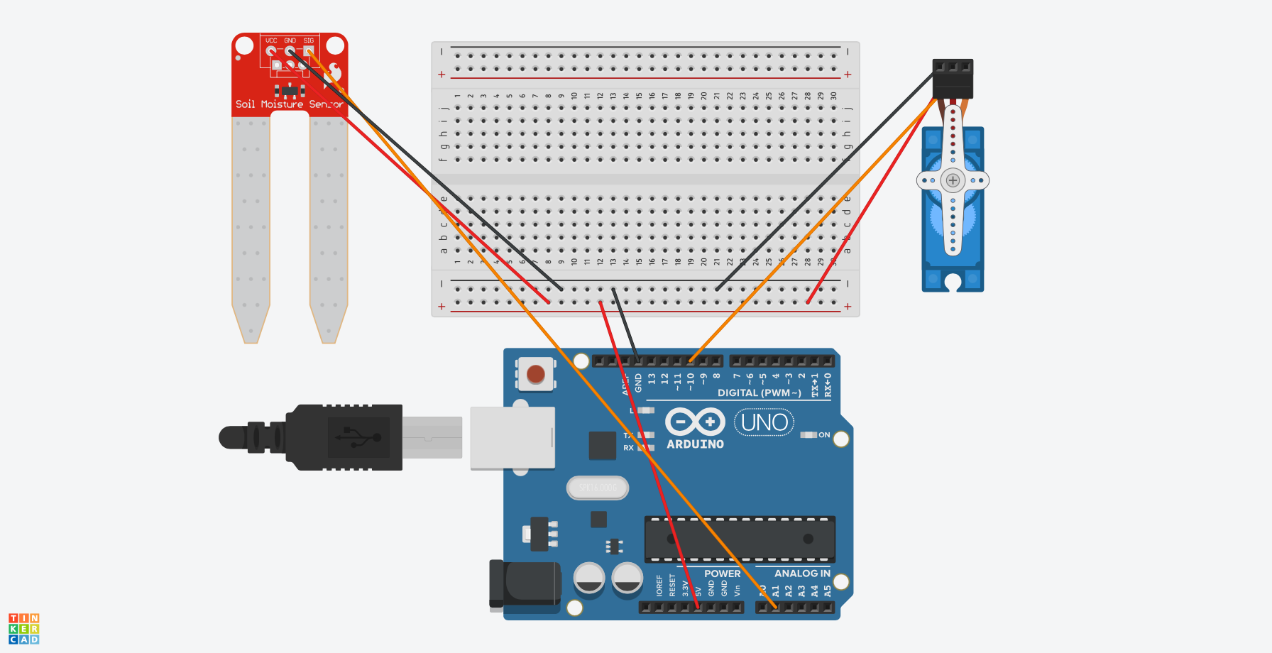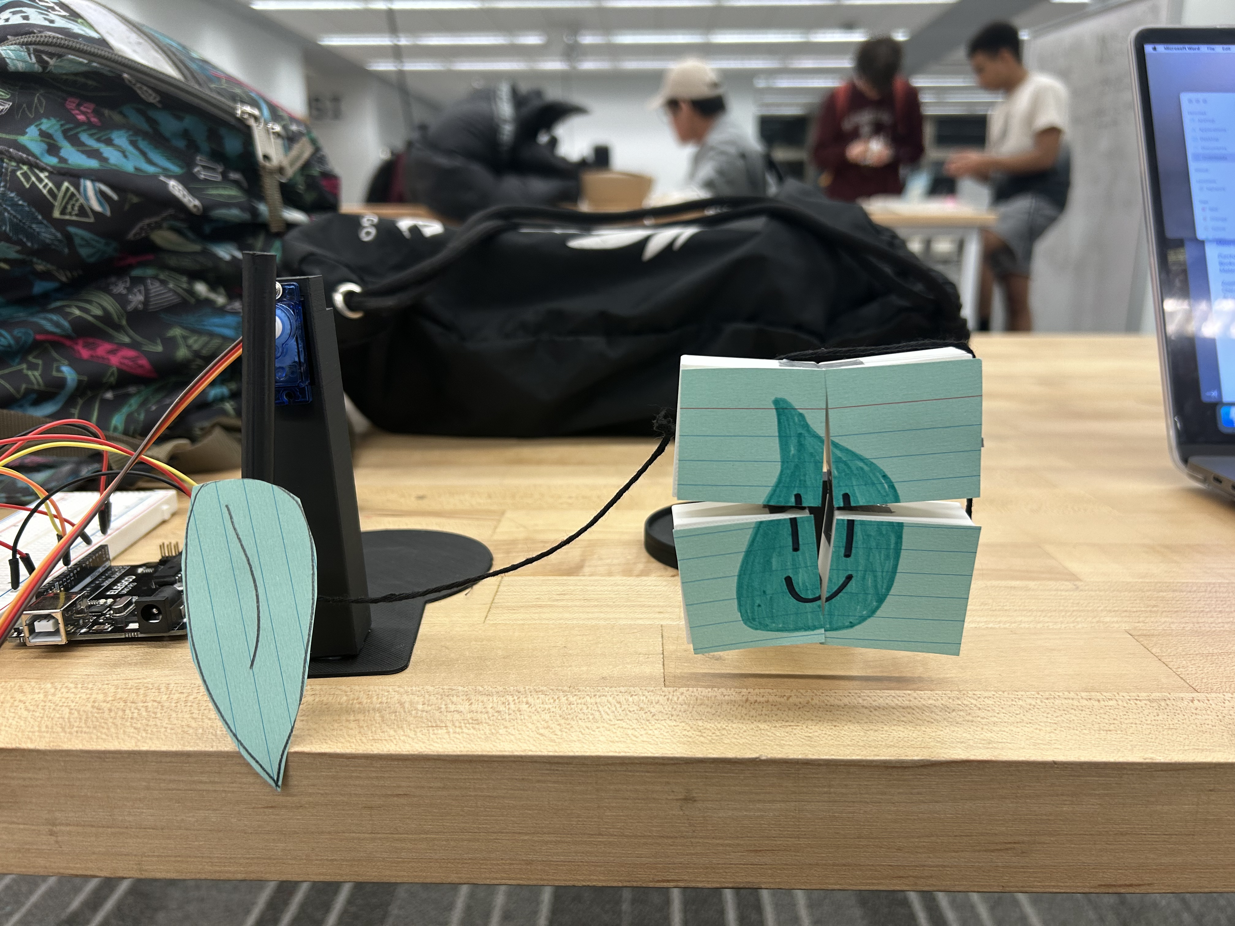 The system used a soil moisture sensor to read the moisture level of the soil in the planer. If the dryness level is above a certain threshold, the servo will rotate to the left 180 degrees, pulling the string and causing the picture to move. The inverse is also true, if the dryness level is below a certain threshold, the servo will rotate to the right 180 degree, releasing the string and moving the picture back in place. This threshold can be set by the user to correspond to their specific plant.